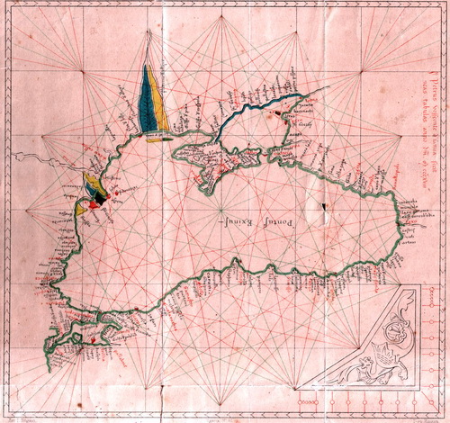 Фото. Факсимиле порту(о)лана Черного и Азовского морей с обозначенными на нём многочисленными торговыми факториями Генуи, Венеции, Пизы португальского картографа Диого Омема (порт. - Diogo Homem – 1521 г. – 1576 г.), работавшего в Венеции. 1559 год.