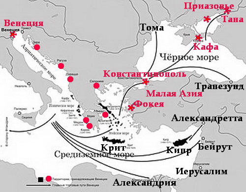Фото. Территории и главные морские пути Венецианской морской империи [Википедия: Светлейшая Республика Венеция (Республика Святого Марка; итал. - Serenissima Repubblica di Venezia, рус. - Посполитая Рєчь Венецкая или Посполитая Рєчь Венеційска) - с конца VII века по 1797 год республика в Европе со столицей в городе Венеция. Венеция - государство в северо-восточной части территории современной Италии, имела колонии на территории государств, лежащих в Адриатике, бассейнах Эгейского, Мраморного, Черного и Азовского морей, управлялась выборным органом - Институтом дожей, который существовал ровно 1100 лет (697—1797)].