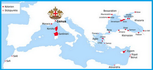 Фото. Колонии Генуэзской морской империи [Википедия: Светлейшая Генуэзская республика (Республика Святого Георгия; итал. - Serenissima Repubblica di Genova, рус. - Рєчь Посполитая Генуесская или Рєчь Посполитая Геновеская) – независимое государство на северо-западном побережье Апеннинского п-ова с 1005 года – по 1795 год].