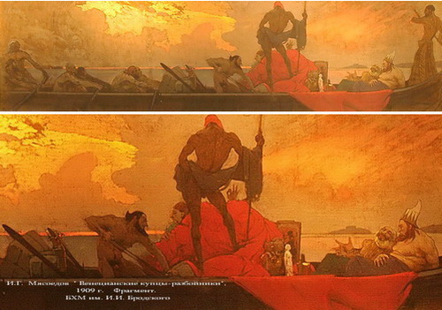Фото. Венецианские купцы на картине И.Г. Мясоедова "Венецианские купцы-разбойники", 1909 г. Холст, масло. 70 x 285 см. Бердянский художественный музей, им. И. Бродского.