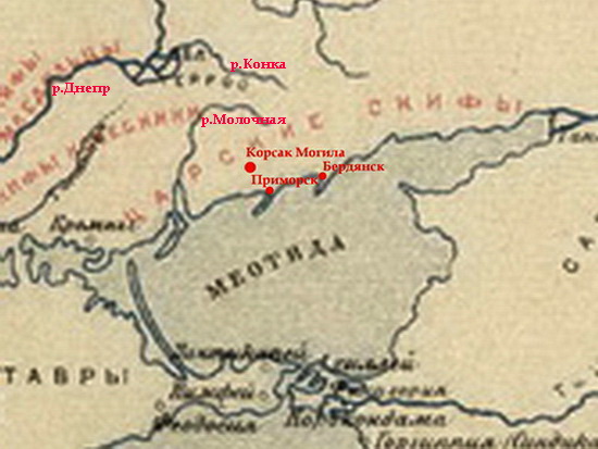 Фото 3. Фрагмент учебной карты К. В. Кудряшова (1885 - †1962) «Скифия 5 века до н.э. по Геродоту». На территории, примыкающей к северному берегу Меотиды (Азовского моря), указан ареал обитания скифов царских. Расположение «Корсак Могилы», а также Приморска и Бердянска на этом фрагменте карты обозначено автором статьи. - В.К.