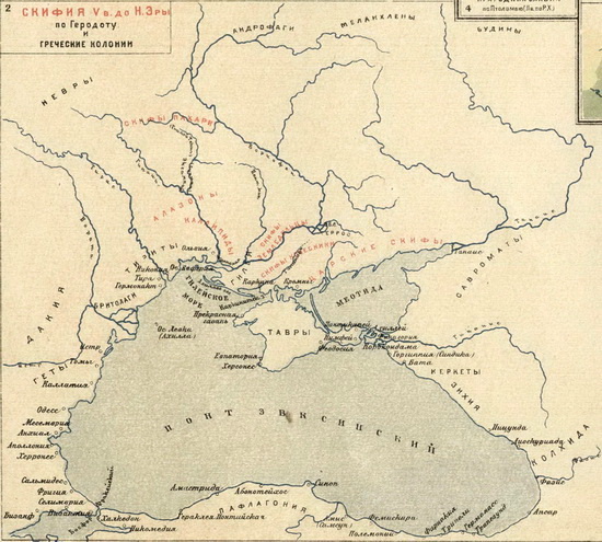 … “За рекой Герром идут так называемые царские владения. Живет там самое доблестное и наиболее многочисленное скифское племя. Эти скифы считают прочих скифов себе подвластными. Их область к югу простирается до Таврики, а на восток – до рва, выкопанного потомками слепых рабов, и до гавани у Меотийского озера по имени Кремны”…