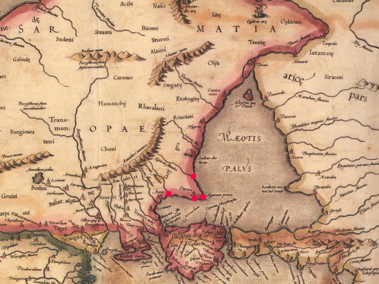 …Восточную границу Сарматии составляют: перешеек от реки Керкинита, озеро Вика [озеро Вика – озеро Бык – залив Сиваш Азовского моря. – Прим.], береговая линия Меотийского озера до реки Танаиса, самая река Танаис, наконец, меридиан, идущий от истоков Танаиса к неизвестной земле до вышесказанного предела…