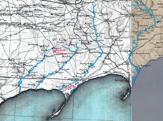 Фото 4. Реки Корсак, Лозоватка, Обиточная (Дженалгаш, Дженалгиш, Обаташ) и Берда (Агара, Агарлиберт, Кая’ла, Берла) на десятиверстной карте Генерального штаба И.О. Стрельбицкого (1828, Голинка Полтавской губернии – †1900, Голинка), в редакции 1911 года. Расположение Корсак Могилы у Мануйловки, царских курганов в нижнем течении р. Обиточной близ г. Ногайска (Приморска) и скифского кургана 5 века до н.э. у Владимировки обозначено автором статьи. - В.К.