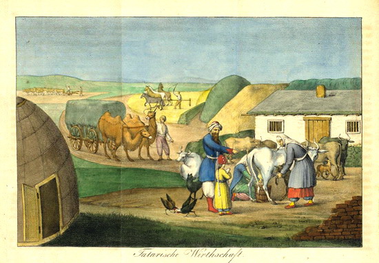 Фото 9. «Ногайская усадьба (Tatarische Wirtschaft) в Северном Приазовье» на гравюре с рисунка Даниеля Шлаттера (1791 - †1870) – швейцарского миссионера, путешественника и этнографа, долгое время прожившего в ауле Доменге Буркуд у Молочных Вод близ Новоалександровки (ныне г. Мелитополь) среди ногайцев и подробно описавшего быт и обычаи этого последнего кочевого народа Европы в своей книге «Фрагменты из некоторых поездок по южной России в 1822-1828 гг. - Bruchstücke aus einigen Reisen nach dem südlichen Russland in den Jahren 1822 bis 1828», изданной в 1830 году в швейцарском Санкт-Ґаллене.