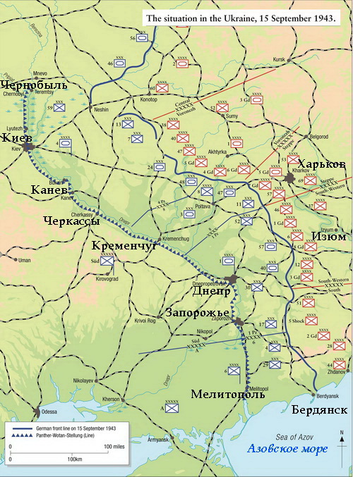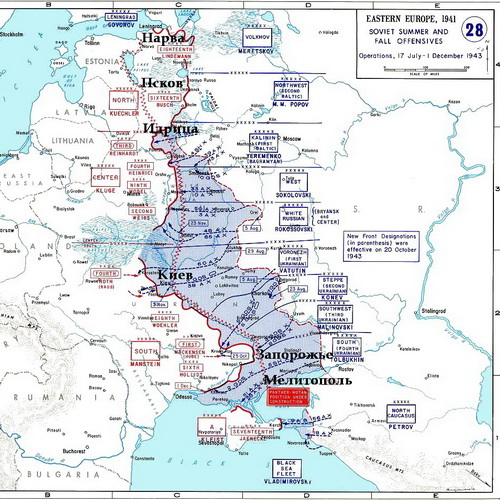 Фото 1. Карта Восточного фронта 2-ой Мировой войны в июле –декабре 1943 года. Красная зигзагообразная линия – т.н. Восточный вал („Ostwall“) - немецкая линия обороны, состоящая из двух рубежей – позиции «Вотан - Wotan-Stellung», и позиции «Пантера - Panther-Stellung». Позиция Вотан - Wotan-Stellung, названная в честь Вотана – Одина - верховного бога в германо–скандинавской мифологии (на шведском - Oden, на старосаксонском - Woden, на старофранкском - Wodan, на немецком - Wotan), проходила от Азовского моря по реке Молочной и далее по Днепру.