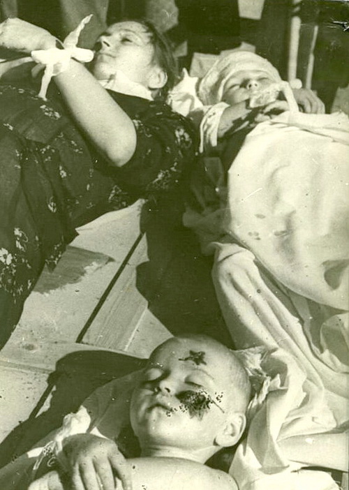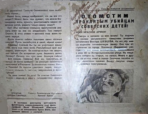 «Нацистские изверги вырезали звезду у пятилетнего Вити Шевцова, а затем убили малыша». (О том, что этот снимок был предъявлен на Нюрбергском процессе написано в сборнике «Бердянск. Взгляд через столетие» - авт.)