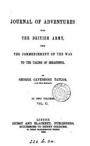 Джордж Кэвэндиш Тейлор [1827, Шропшир, Англия – 1889, Лондон], «ЖУРНАЛ ПРИКЛЮЧЕНИЙ С БРИТАНСКОЙ АРМИЕЙ, ОТ НАЧАЛА ВОЙНЫ ДО ВЗЯТИЯ СЕВАСТОПОЛЯ », В ДВУХ ТОМАХ: ТОМ. II. ЛОНДОН: ХЕРСТ И БЛЭКЕТТ, ИЗДАТЕЛИ, НАСЛЕДНИКИ ГЕНРИ КОЛБЕРНА, 13, ВЕЛИКАЯ УЛИЦА МАЛЬБОРО. 1856 - «JOURNAL OF ADVENTURES - WITH THE BRITISH ARMY , FROM THE COMMENCEMENT OF THE WAR TO THE TAKING OF SEBASTOPOL». BY GEORGE CAVENDISH TAYLOR , LATE 95TH REGIMENT , IN TWO VOLUMES : VOL . II . LONDON : HURST AND BLACKETT , PUBLISHERS , , SUCCESSORS TO HENRY COLBURN , 13 , GREAT MARLBOROUGH STREET. 1856