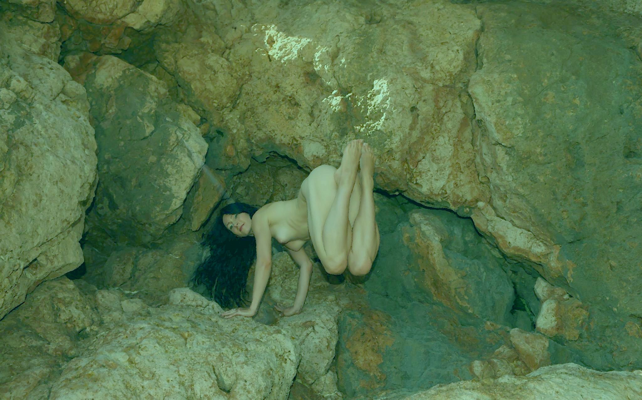 Две женщины, энергично работая ногами и руками быстро погружаются в глубину. Подплывают к подводному обрыву берега, плывут вдоль него. Приближаются к прямоугольному углублению, обложенному камнями, сильно заросшими водорослями. Это напоминает вход в какой-то туннель. Обе, одна за другой, скрываются в нём.