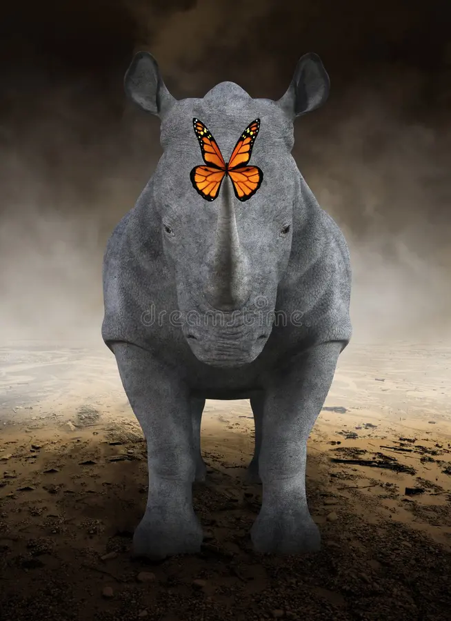 Носорог c бабочкой монарха на роге- в запустелой пустыне ...