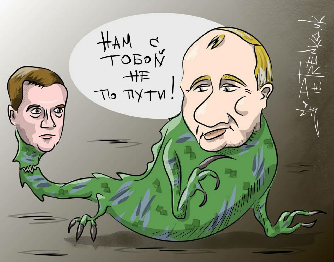 На рисунке- Путин и Медведев в виде двуглавого монстра (типа скорпиона) с головой президента РФ и хвостом с обличьем экс-премьера. Но в какой-то момент хвост отрывается со словами Путина: "Нам с тобой не по пути!".