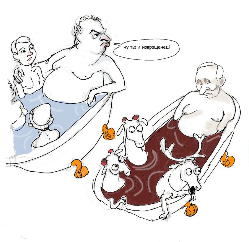 Оба принимают ванну, только Жириновский сидит в обычной воде, обняв парня, а президент России – в кровавой ванне в компании оленей.