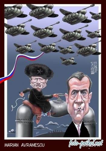 По мере того, как образ Путина вслед за скукоженным Медведевым приобретает всё более юмористические детали, в интернете появляется всё больше карикатур на обоих, как например эта картинка из западных СМИ.