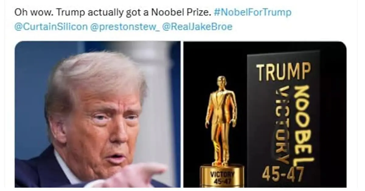 «Trump may impose 100% tariff on the Nobel Prize Committee» — мем-прикол, что он может ужесточить условия даже к комитету. mint