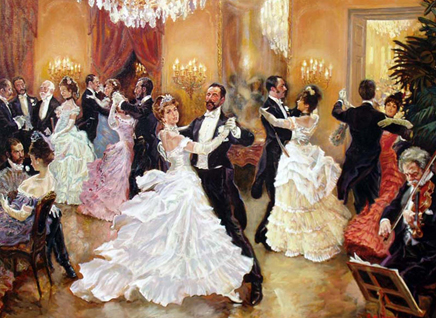 Парадный вход, хозяин всех встречает, тех, кто богаче, больше привечает. Приехавших на бал преклонных лет господ, девиц не замужем, юнцов, в зал малый провожает. Лет средних жёны и мужья, заинтригованные будущей игрой, препровождались в зал большой. А гости - все как на подбор, черно от фраков, на платьях женских вычурный узор.