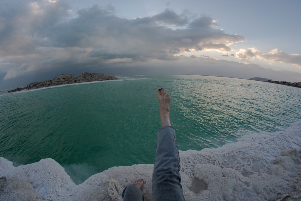 Я фотографировала кадр за кадром, но творческого удовлетворения это не приносило. Я чувствовала, что способна на большее, что ноги не должны уходить в землю, а должны взмывать к небесам! Присев на соляную глыбу у самой кромки воды, я попробовала оторвать от земли две ноги, не получилось. Ладно, решила я, и одной будет достаточно. Нога поднялась в небо, стараясь коснуться пяткой линии горизонта. А я, изгибаясь под тяжестью фотоаппарата, ловила нужный ракурс. Творческая задача была такая: горизонт в виде глобуса и нога как указующий перст! И вот точка найдена, я судорожно нажала на кнопку. Есть! И … потеряв равновесие, словно куль, стала падать в воду…