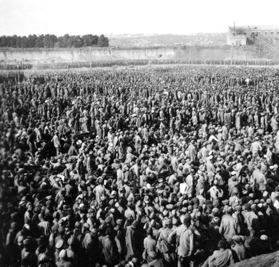 «В ходе боёв на окружение в районе Умани (начало августа 1941 г.) 17-я армия оборудовала два армейских пункта сбора военнопленных, создав ограниченные запасы продуктов «за счёт сбора трофейных запасов и выдачи малоценного продовольствия с армейских складов». 1-я танковая группа и дивизии направляли теперь без предварительного уведомления большую массу пленных в Умань на 16-й пункт сбора, где к 10 августа 1941 г. скопилось 50 000, а к 12 августа - 60 000-70 000 пленных. И, хотя продовольствие на пункте имелось, пищу готовить не могли из-за отсутствия полевых кухонь; воды также не было. 13 августа пленные впервые получили питание, после того как был подавлен бунт путём расстрела «зачинщиков»… - из книги Кристиана Штрайта «Вермахт и советские военнопленные в 1941-1945 гг.» - Die Wehrmacht und die sowjetischen Kriegsgefangenen 1941-1945. — Stuttgart: Deutsche Verlags-Anstalt, 1978. — 445 S.