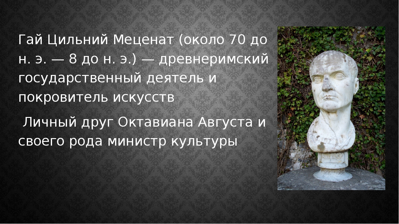 Меценат стал покровителем поэтов Вергилия и Горация, которому за его оды Августу подарил поместье под Римом. Гораций потом переживал, что продался, но виллу оставил.