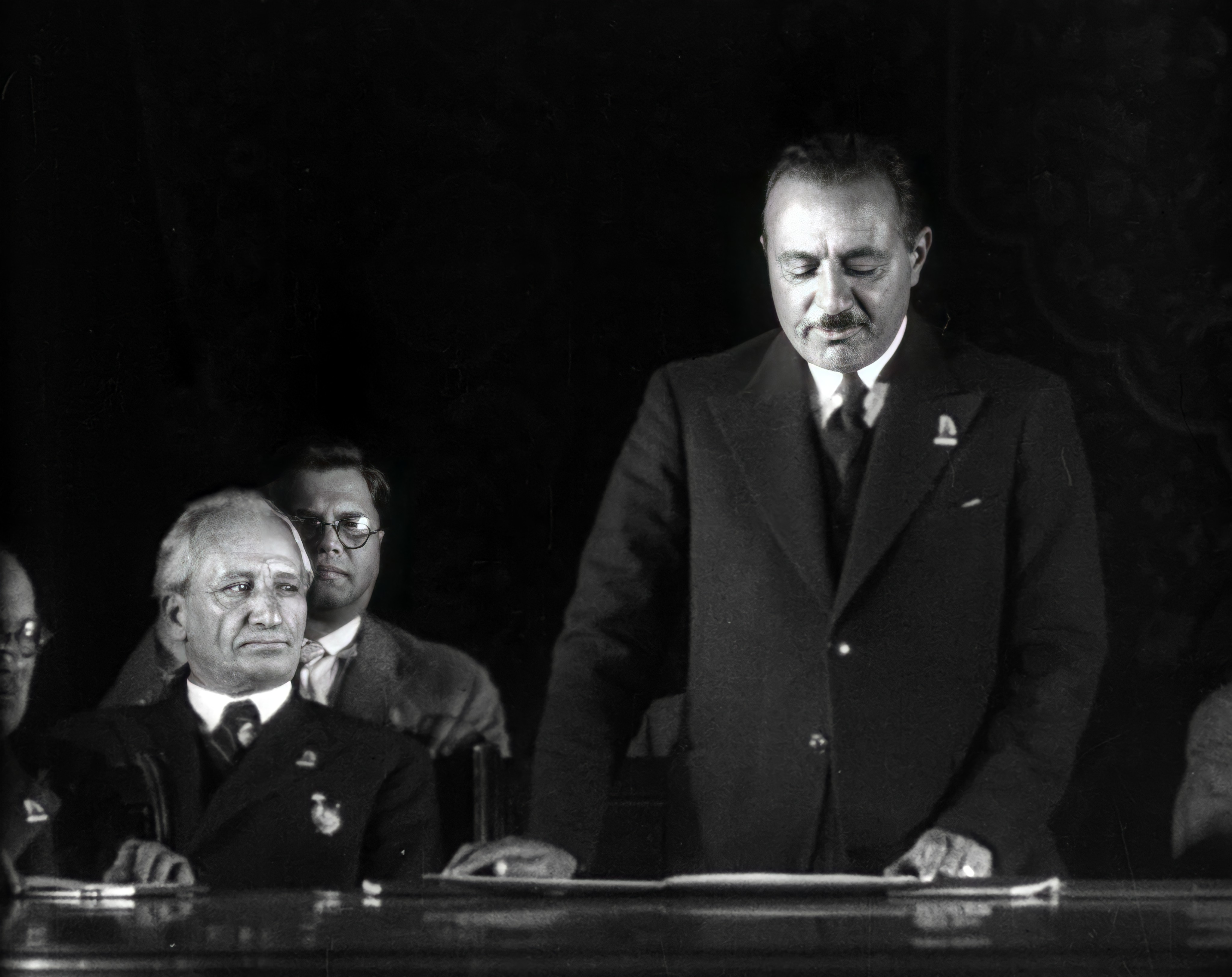 справа от него - стоит выступающий с приветственным словом ( на фарси и английском) Министр просвещения Ирана г-н А. Хекмат, слева: профессор Зарре ( Германия), на втором плане: проф. Аштон ( Англия)