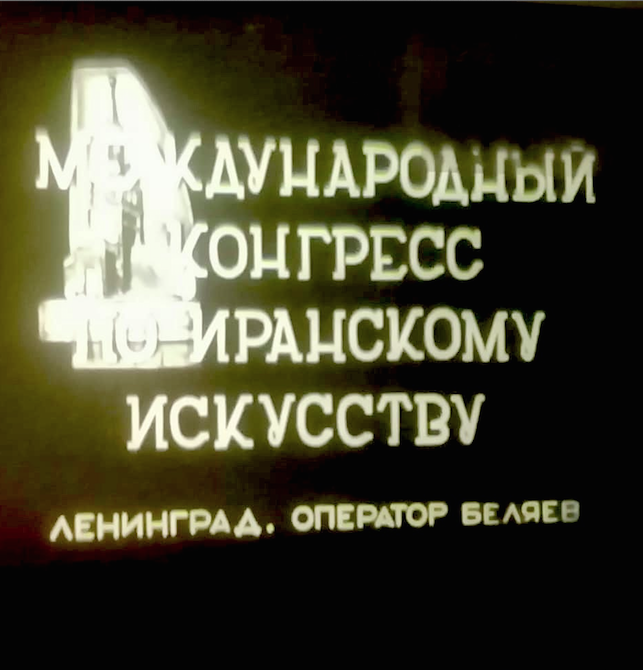 И, наконец, показалось именно то, что ждалось с таким нетерпением - реклама, известившая о начале фильма: «3-ий Международный Конгресс по Иранскому искусству и археологии», Ленинград, оператор Беляев».