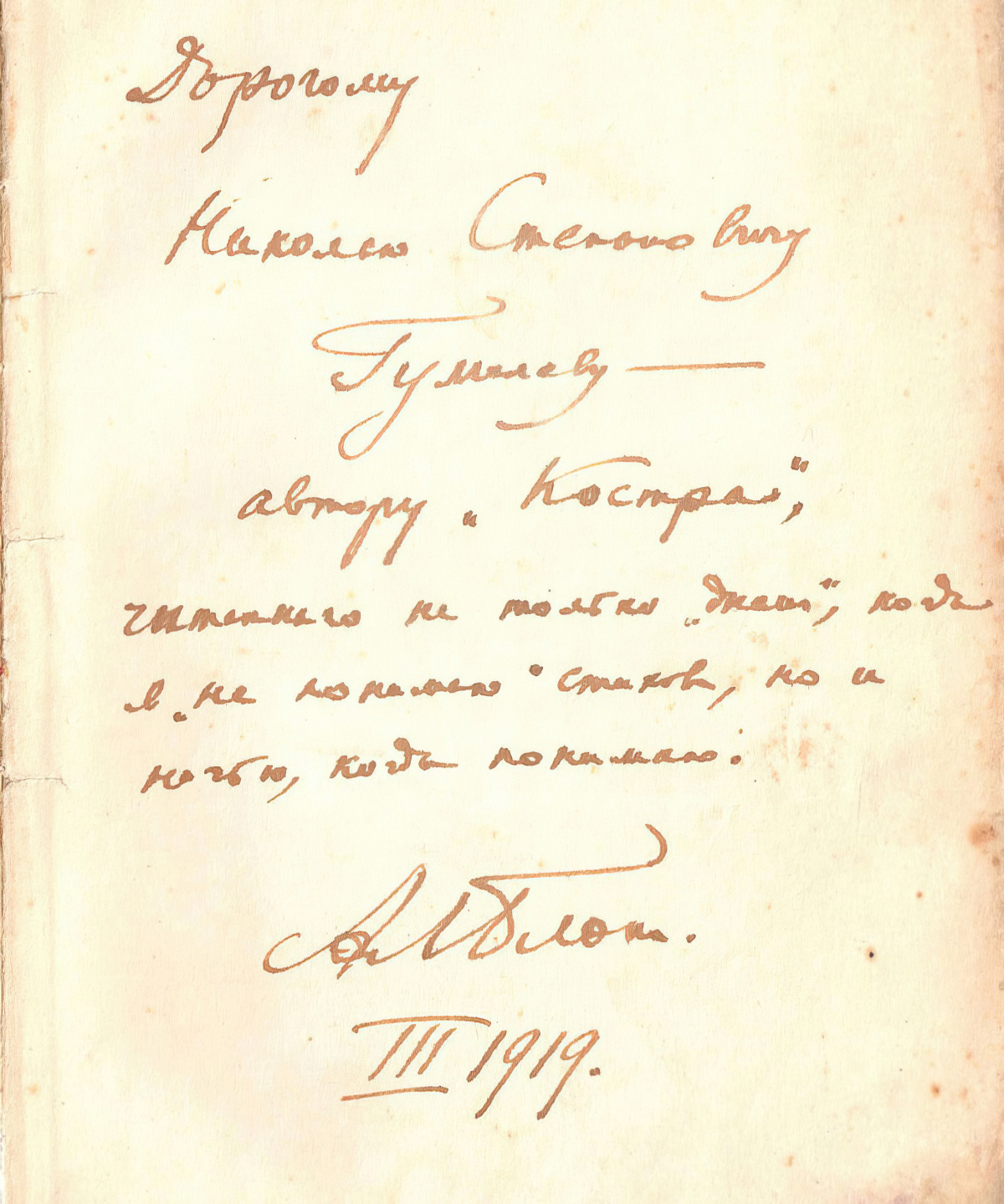 - Дорогому Николаю Степановичу Гумилеву — автору „Костра“, читанного не только „днем“, когда я „не понимаю“ стихов, но и ночью, когда понимаю. Ал. Блок. III 1919