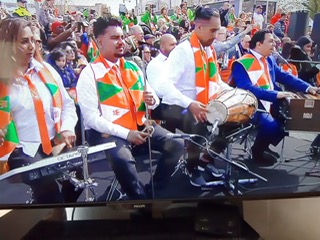 Группа барабанщиков из Индии приветствует королевскую семью стремительнoй барабанной дробью.