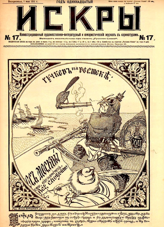 /Номер журнала «ИСКРА», 1911 г., с пропагандисткой иллюстрацией на Титуле, призывая на Ближний Восток, и, как "завещали предки», метя в проливы и Царь-Град не только подзорной трубой, вышел в разгар, накалившихся до предела страстей, как раз накануне «двойной « Балканской войны», сыгравшей, благодаря усилиям Болгарского Фердинанда, на отрез отказавшегося от православия, и мнившего себя королем Балканским, похоронный марш детищу Николая (последнего) - Балканскому Союзу, собственно, прятавшееся под маской дружбы «орудие войны» ( Р. Пуанкаре), для броска на Турцию с Балканского плацдарма./