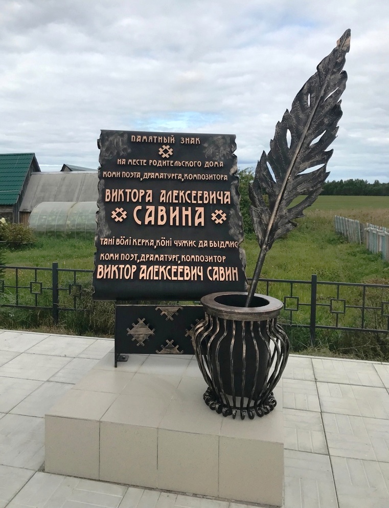 Дом, где поэт появился на свет, тоже давно исчез. На его месте находится изготовленный по эскизу корткеросского кузнеца Игоря Усачева арт-объект в виде железного гусиного пера в чернильнице и большого металлического свитка с надписью, что именно здесь находился родительский дом Виктора Савина.