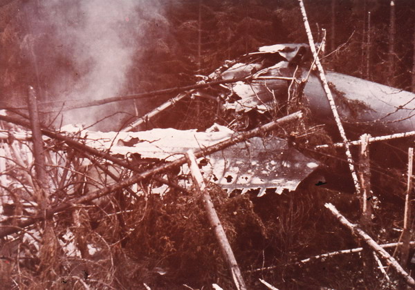 На обратном пути два мотора вовсю горели. К тому же была допущена ошибка: самолёт не свернул на Пушкин, а пошёл на Хельсинки. Когда разобрались, стали выворачивать на восток. Но машина уже падала; и, снеся огромное количество деревьев, да ещё стукнувшись о валун, рухнула в лесу. От пожара было светло как днём. Выжить удалось пятерым.
