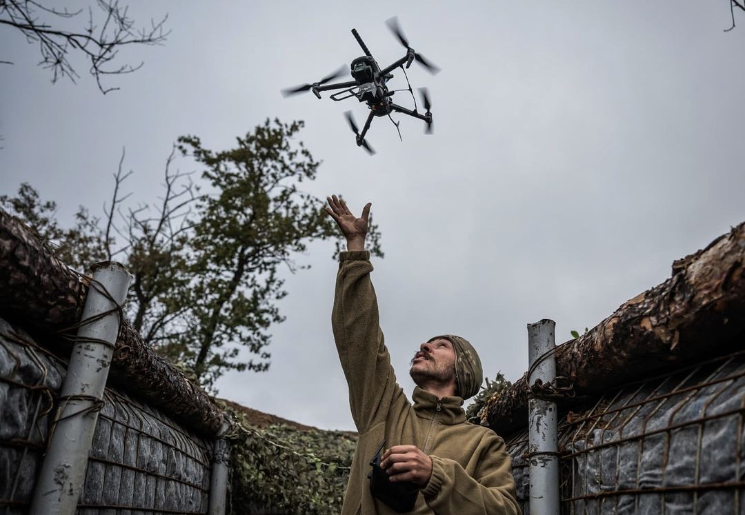 Боец механизированного батальона «Волки Да Винчи» Вооруженных Сил Украины запускает FPV дрон с украинских позиций в Донецкой области. Фото: В.Ратинский