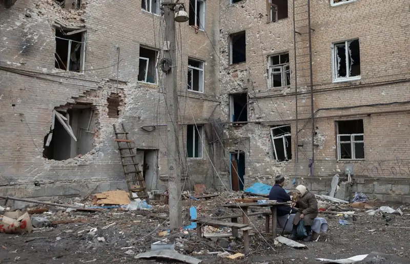Местные жители во дворе разрушенного дома в Часовом Яре, 2024 г.