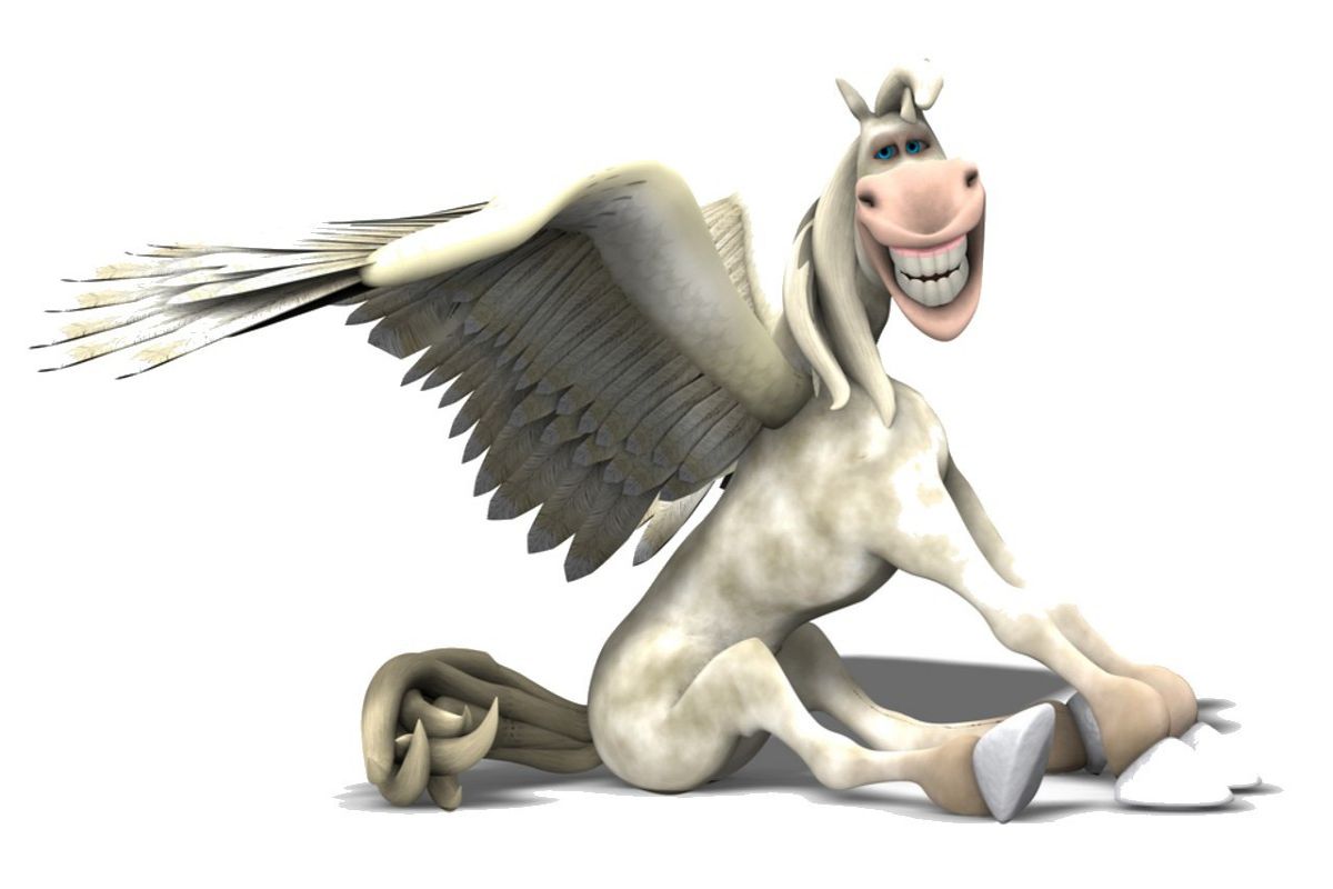 Среди „потомков" или „родственников" Пегаса есть и еще одно существо. Все что о нем известно, так это то, как оно выглядит, но, правда, не очень понятно, к какому семейству его причислить: однорогий конь с крыльями – крылатый единорог. Некоторые источники называют его аликорн или пеликорн. Существо до конца не изучено и здесь простор для творчества художников и поэтов.
