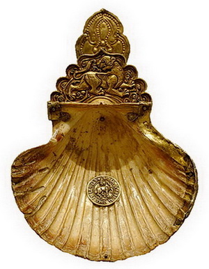 Фото. Ковшик из морской раковины с серебряной ручкой из Бердянского клада, обнаруженного в 1892 (1894 - ?) году на месте некогда существовавшего на берегу Азовского моря торгового города Полоники (Polonixi) Венецианской морской империи. Ныне сохраняется в Восточной коллекции Российского Государственного Эрмитажа в г. Санкт Петербурге. В средневековой Европе паломники (пилигримы), побывавшие в Святой Земле, нашивали такие раковины на одежду, и они являлись символом божественного покровительства и защиты. В центре ракушки, обрамленной позолоченным серебром, расположен серебряный жетон с изображением барана - характерным для ювелирных изделий, изготовленных на территории самой Золотой Орды. Надпись на армянском языке гласит - “Шахук, раб Бога”. Судя по армянской надписи на жетоне, ковшик из Бердянского клада принадлежал жителю приазовских Полоник армянской национальности – выходцу из Киликии - средневекового Армянского государства в юго-восточной части Малой Азии, захваченного в 1375 году египетскими мамлюками. Помимо «ковшика из морской раковины» в Бердянском кладе были обнаружены также “фрагменты серебряной обкладки кувшинчика (тулово, возможно из кокосового ореха, утрачено), две серебряные чашечки и 72 накладки из серебра, служившие очевидно, украшением убора верхового коня”… - Смирнов Я.И. Восточное серебро. Атлас древней серебряной и золотой посуды восточного происхождения, найденной преимущественно в пределах Российской империи. – СПб.: Издание императорской археологической комиссии, 1909 г.